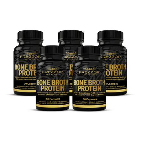 Revitalize your whole body with FREZZOR collagen protein made from hormone and antibiotic-free New Zealand cattle. Our cattle graze on grass and herbs ensuring a super clean collagen protein with no additives for easy absorption. Because of this we can produce a collagen supplement that is GMO-free which can help positively sustain the environment while sparing your body toxins. When you use these supplements you’ll find it supports skin hydration and elasticity which can cause a more youthful appearance. This bone broth collagen accomplishes this by helping to reduce wrinkles and cellulite creating a smoother feel to your skin. Containing collagen protein types I II III V VI VII and IX this supplement ensures your body receives the variety of proteins it needs for stronger bones ligaments tendons and muscles. As a result these collagen pills fortify your body so your system becomes healthier and can even strengthen your stomach and digestive tract which helps you absorb the nutrients your body needs. One bottle contains 90 capsules. FREZZOR Bone Broth Protein Supplements 5 Bottles per Pack 450 Caps: