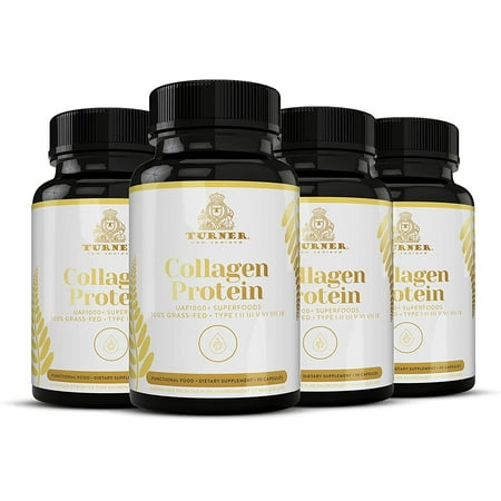 Give your body what it needs to keep up with your active lifestyle using this collagen protein supplement by TURNER. An essential protein for numerous bodily systems collagen helps rebuild joints and cartilage to maintain flexibility and a full range of movement. It s also a powerful hair skin and nails supplement keeping all three strong and looking youthful and vibrant. Stay consistent with workouts and keep up your routine thanks to shorter recovery times as muscles rebuild faster. Sourced from grass-fed cows bovine collagen protein is highly sustainable and free of hormones GMOs and antibiotics. It s also easy to digest so you experience the full range of benefits. This joint health supplement contains seven types of collagen to support the digestive system as well as ligaments skin and fingernails. It also has hyaluronic acid vitamin C and zinc to further support collagen absorption and to strengthen the immune system. This 4-pack has 90 New Zealand collagen capsules for a total of 360. TURNER New Zealand 100% Grass-Fed Protein Collagen Capsules 360 Capsules 4 Count: